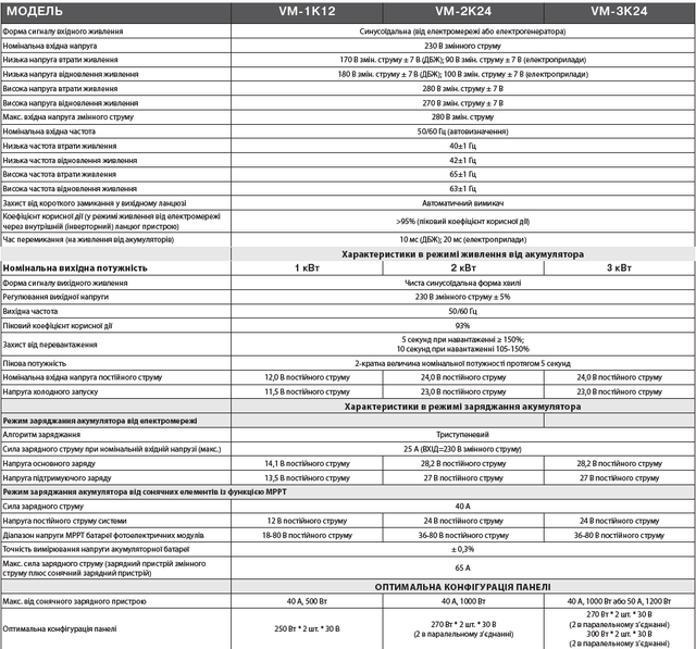- АКБ - 24 В, заряд мережа 25 А та від сонця 40 А.