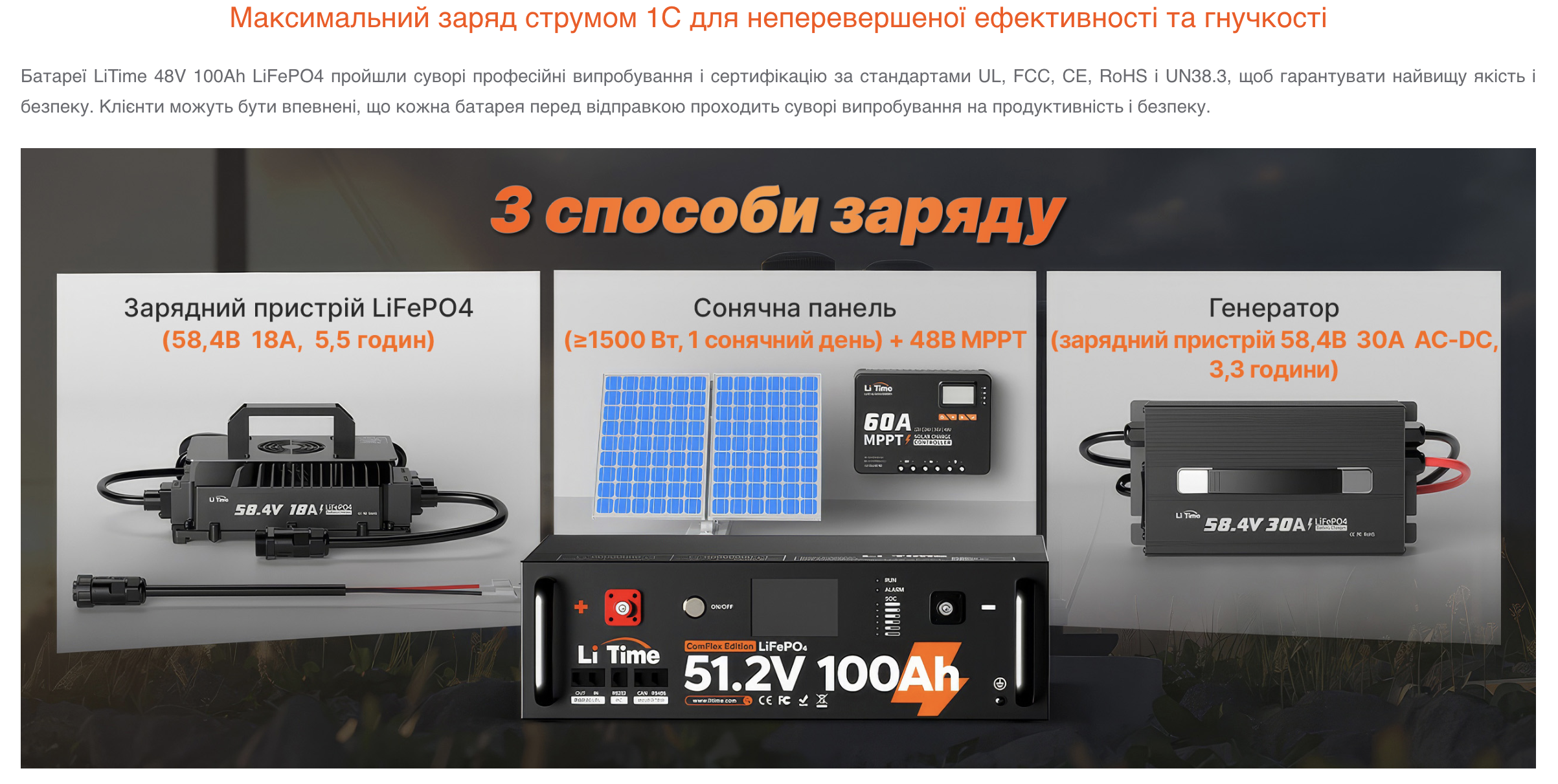 - Рекомендований струм заряду: 20 ампер (0.2C), оптимальний для швидкого та безпечного поповнення енергії.