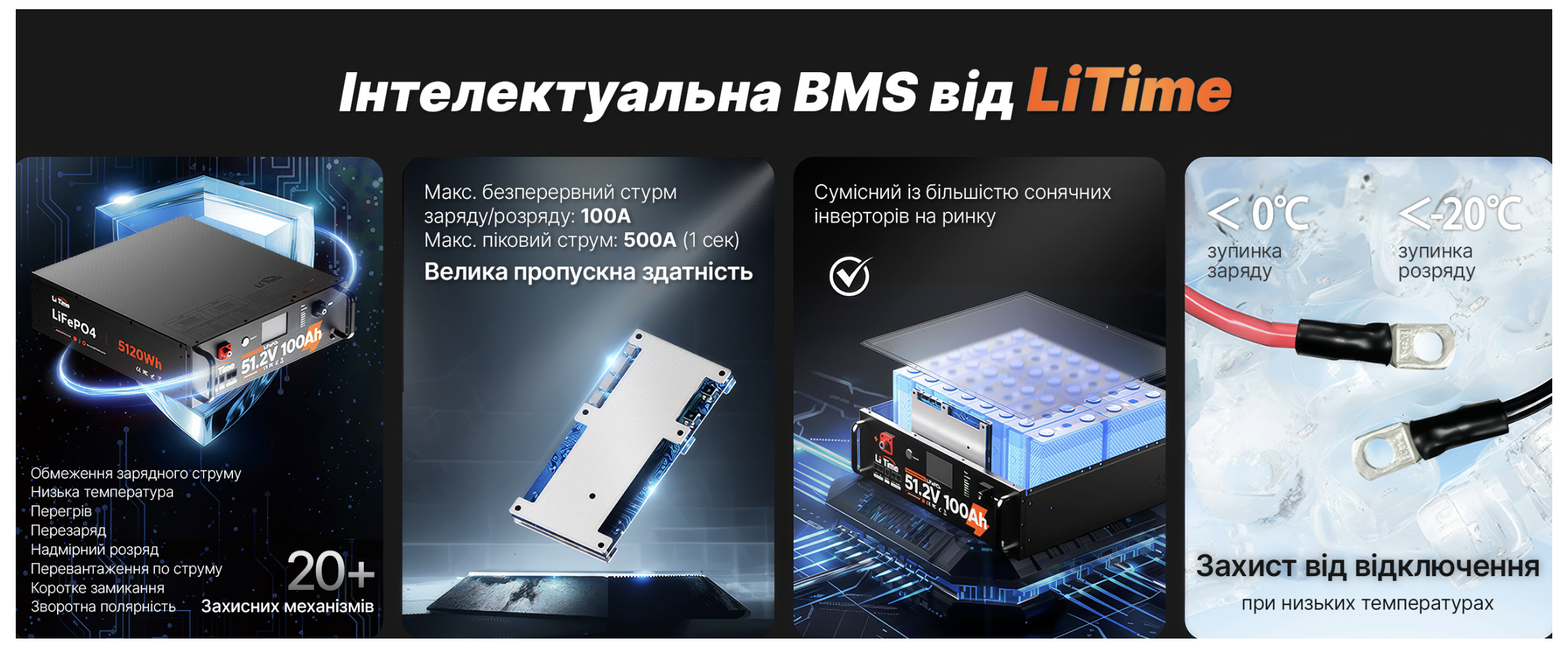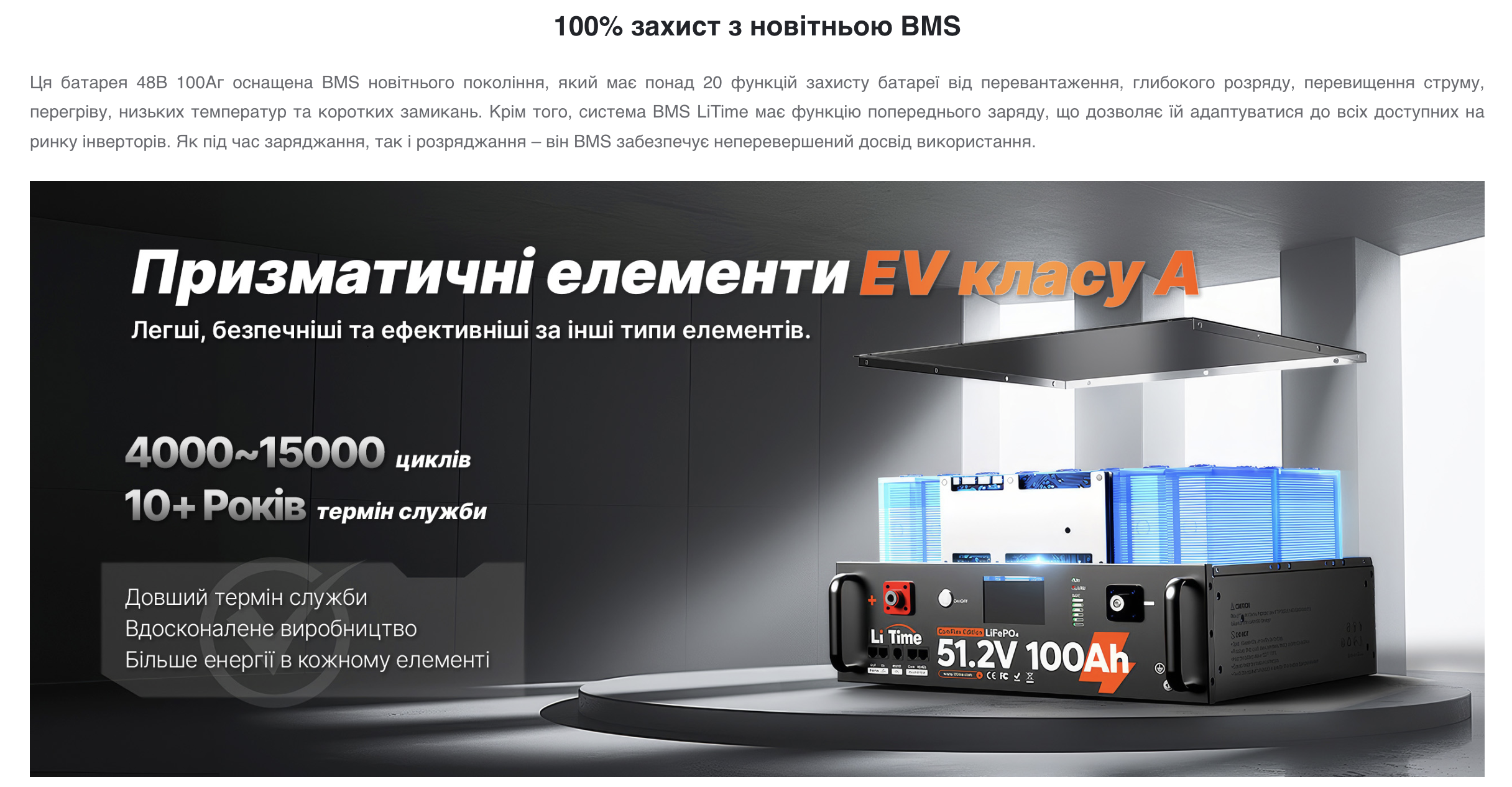 - Плата системи керування батареєю (BMS): 100 ампер, з інтегрованим захистом.