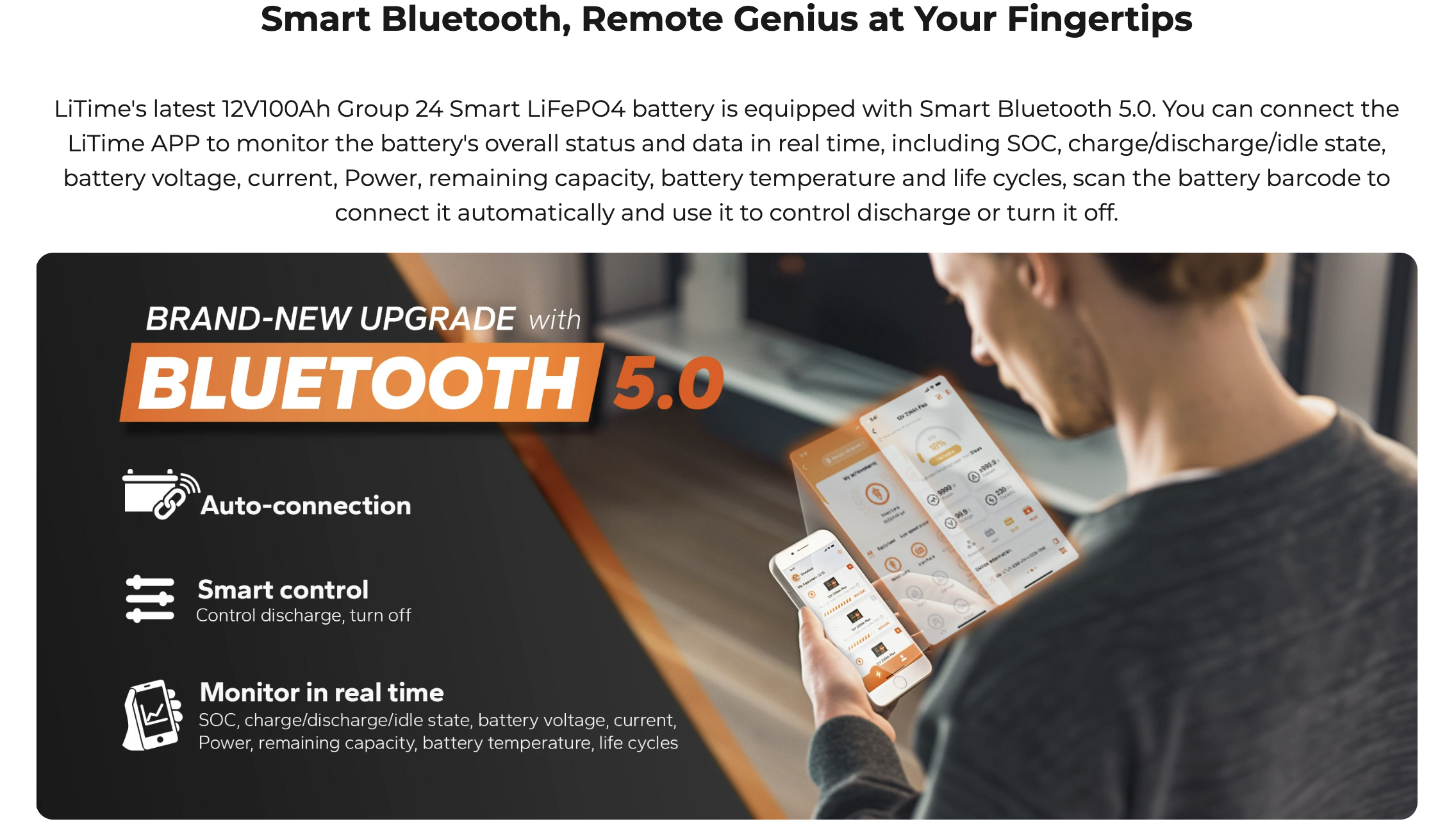 Завдяки передовій технології LiFePO4 та інтелектуальним функціям цей пристрій забезпечує стабільне постачання енергії в сонячних установках, транспортних засобах, яхтах та кемпінговому обладнанні. Можливість моніторингу через Bluetooth 5.0 дозволяє контролювати параметри в реальному часі за допомогою мобільного застосунку, що значно спрощує щоденну експлуатацію.