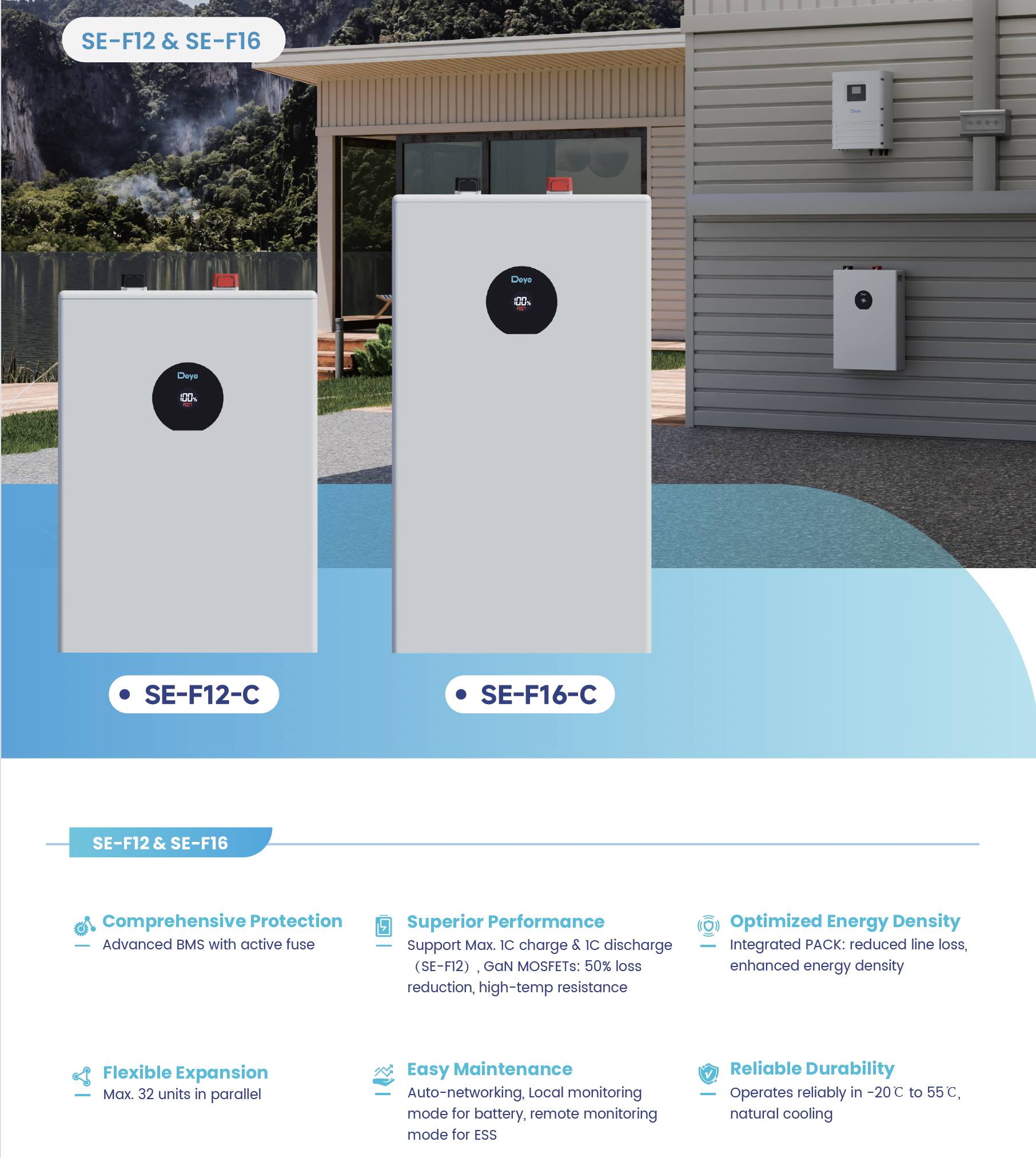 Інтелектуальна система зберігання енергії Deye SE-F16-C — це технологічний флагман у лінійці низьковольтних накопичувачів, що вирізняється вражаючим показником ємності 314 А·год. Завдяки впровадженню інтегрованої архітектури PACK, виробнику вдалося досягти максимальної щільності енергії при суттєвому зменшенні опору в провідниках, що гарантує стабільну роботу вашої автономної мережі. Використання сучасних компонентів та просунутої BMS-плати з активним запобіжником робить цей пристрій одним із найбезпечніших рішень для сучасного енергонезалежного будинку.