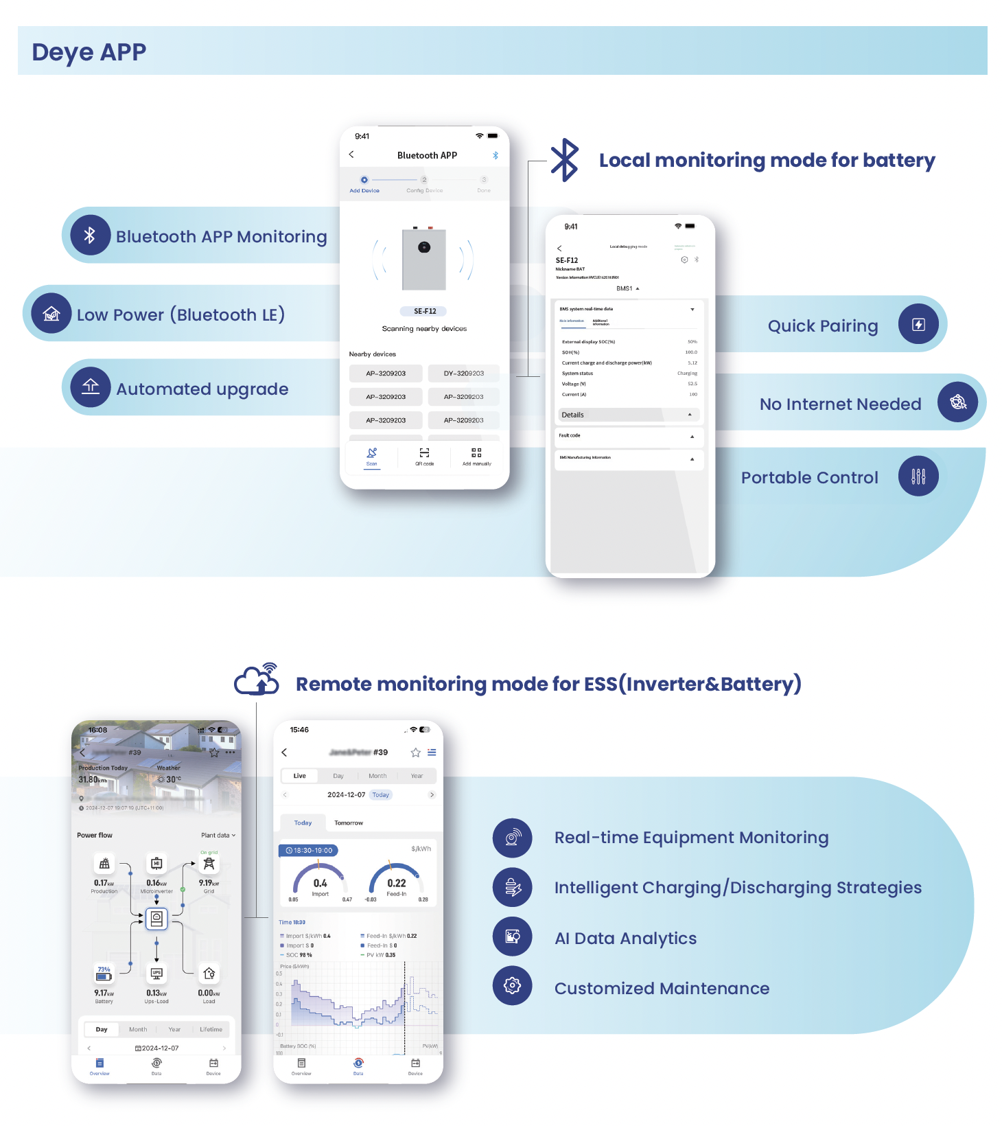 Цей енергетичний модуль створений для тих, хто цінує надійність та простоту в експлуатації. Можливість локального моніторингу через Bluetooth-додаток дозволяє контролювати стан осередків навіть без доступу до глобальної мережі, а природне охолодження забезпечує безшумну роботу протягом усього терміну служби. Гнучкість монтажу та підтримка великих кластерів дозволяють адаптувати систему під будь-які потреби споживача.