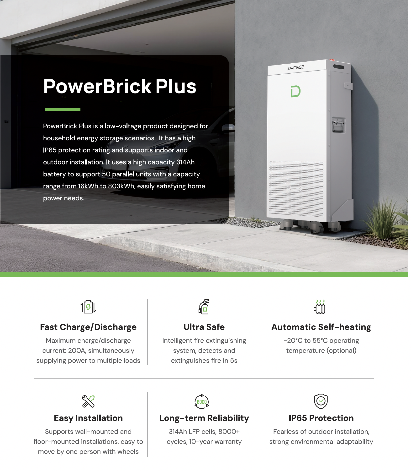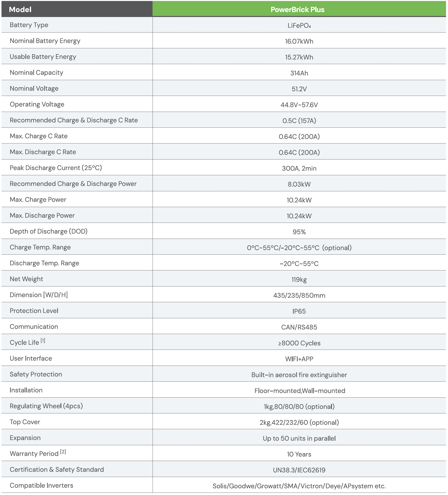 Dyness PowerBrick Plus — це низьковольтний акумулятор на літій-залізо-фосфатних елементах (LiFePO4) з номінальною ємністю 314 Ач та енергією 16.07 кВт·год, спроєктований для побутових систем зберігання електроенергії з можливістю підключення до 50 модулів паралельно, що забезпечує масштабування до 803 кВт·год у єдиній установці.
