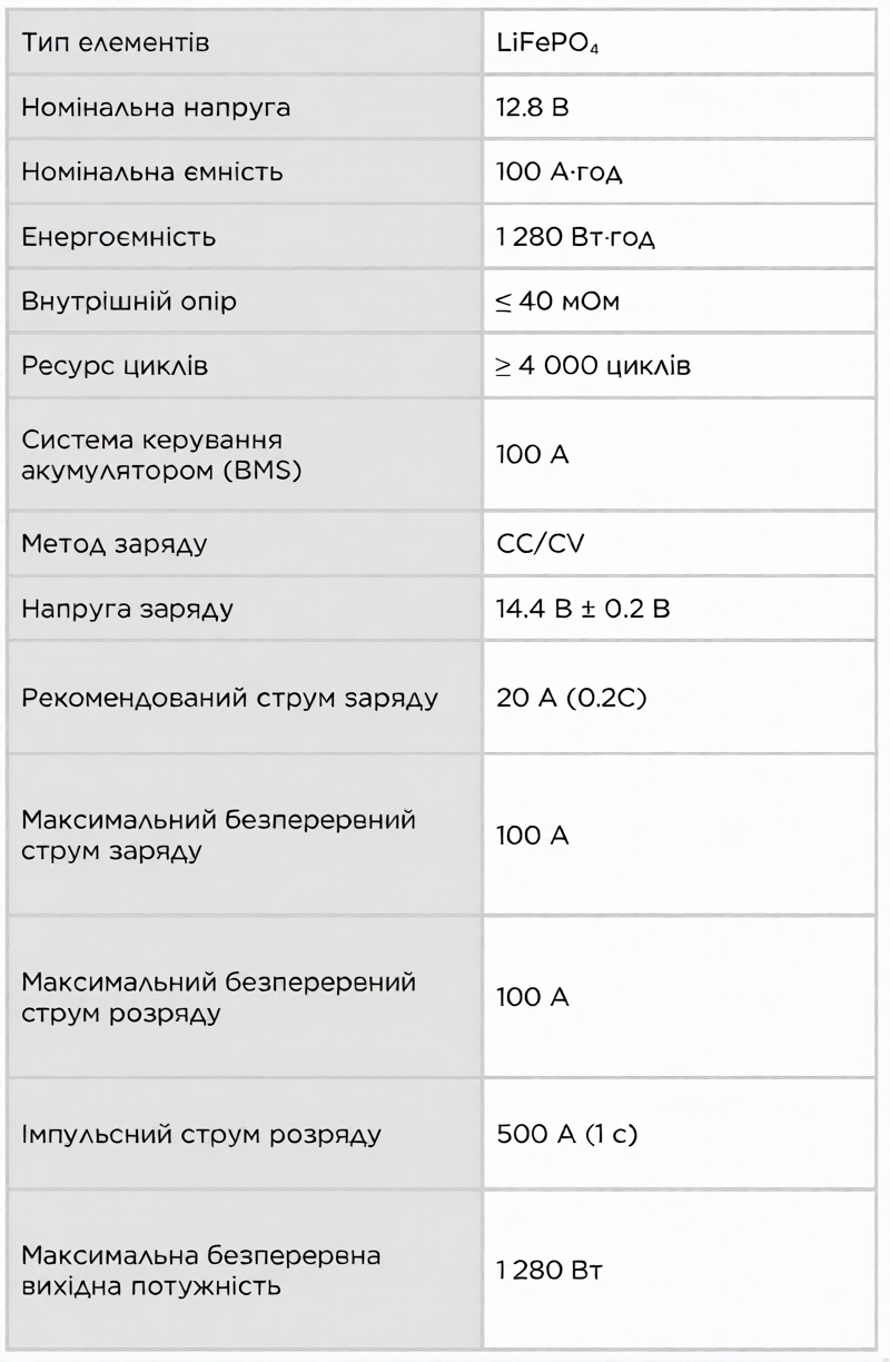 - Загальний ресурс: понад 4000 циклів за умови повної глибини розряду
